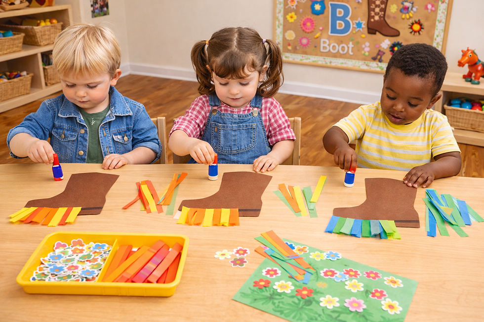 We incorporate rodeo-themed books, vocabulary, and letter exploration into daily circle time. Children are introduced to new words like barn, horse, boots, and lasso, while strengthening early phonemic awareness and listening skills.